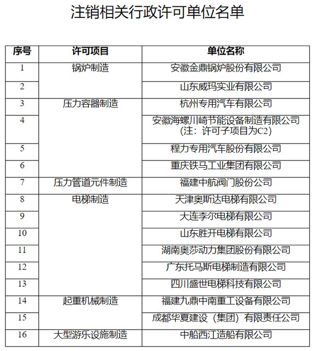(一)依法注銷16家特種設(shè)備生產(chǎn)單位(詳見附件1)的相關(guān)行政許可。