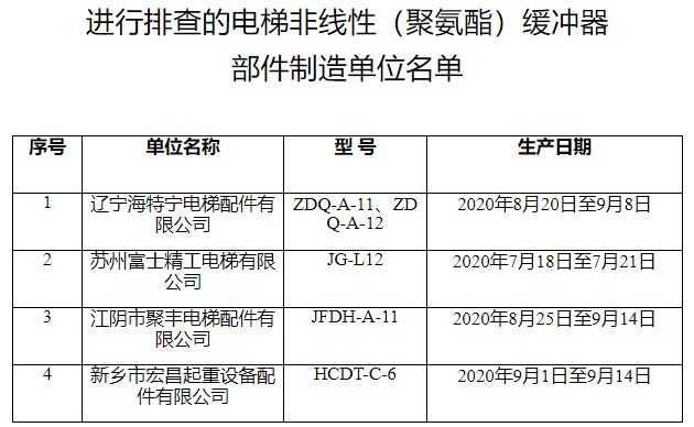 (四)選用遼寧海特寧電梯配件有限公司、蘇州富士精工電梯有限公司、江陰市聚豐電梯配件有限公司、新鄉(xiāng)市宏昌起重設(shè)備配件有限公司4家單位生產(chǎn)的非線性(聚氨酯)緩沖器(具體型號和生產(chǎn)日期詳見附件3)的電梯整機(jī)制造單位應(yīng)立即進(jìn)行排查,并負(fù)責(zé)免費(fèi)更換。